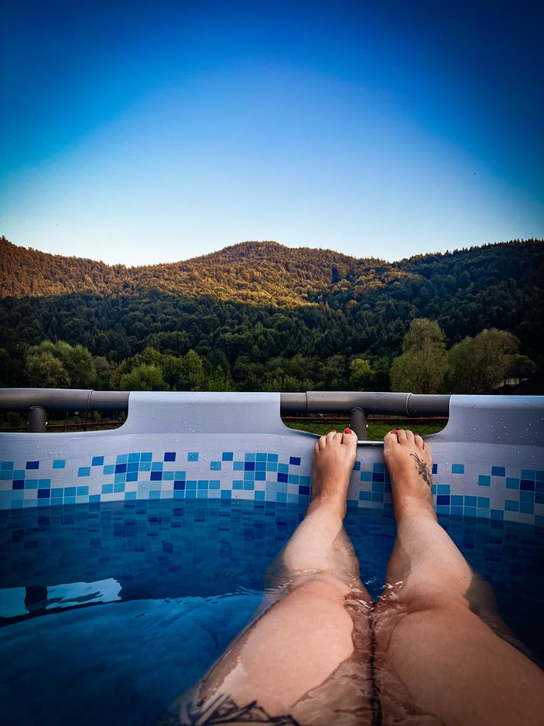 M-am văzut acum câteva zile într-o poză. Un instantaneu candid cu fiică-mea la piscină. Vreme bună, apă limpede, pădure, frumos, în fundal. Totul mirific.